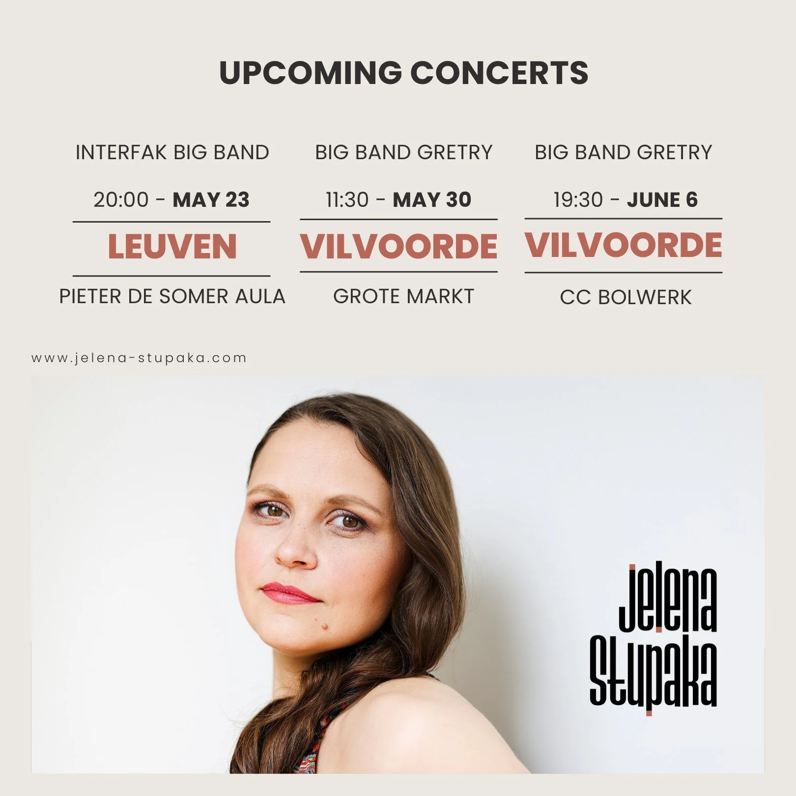 Jelena Stupaka will tour Flemish Brabant (BE) with the Interfak and Gretry Big Bands on May 23, 30 and June 6, 2026.
